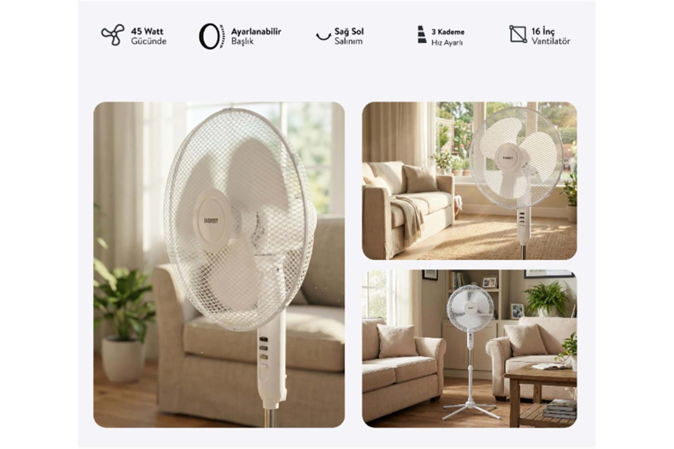 Everest FAN10 EcoWind Beyaz Metal Yıldız Ayak 3 Bıçaklı Vantilatör- Pervanesi 16" Maks 45W 3 Kademe 1100RPM
