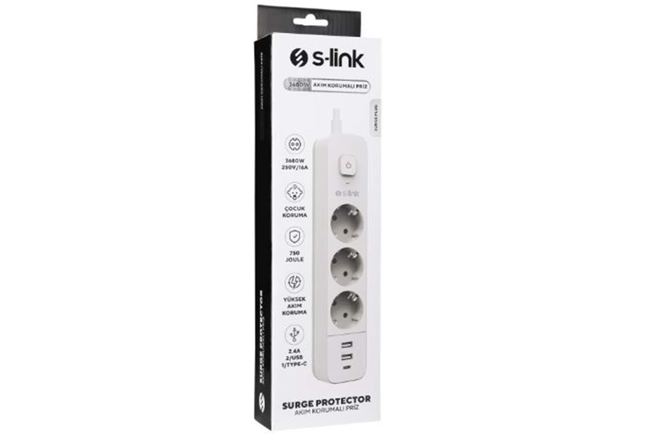 S-link SPG03TC 5V2.4A 1.5m 3x1.00mm 100 yüzde Bakır 750 Joule 3 lü Anahtarlı Akım Korumalı Beyaz Priz