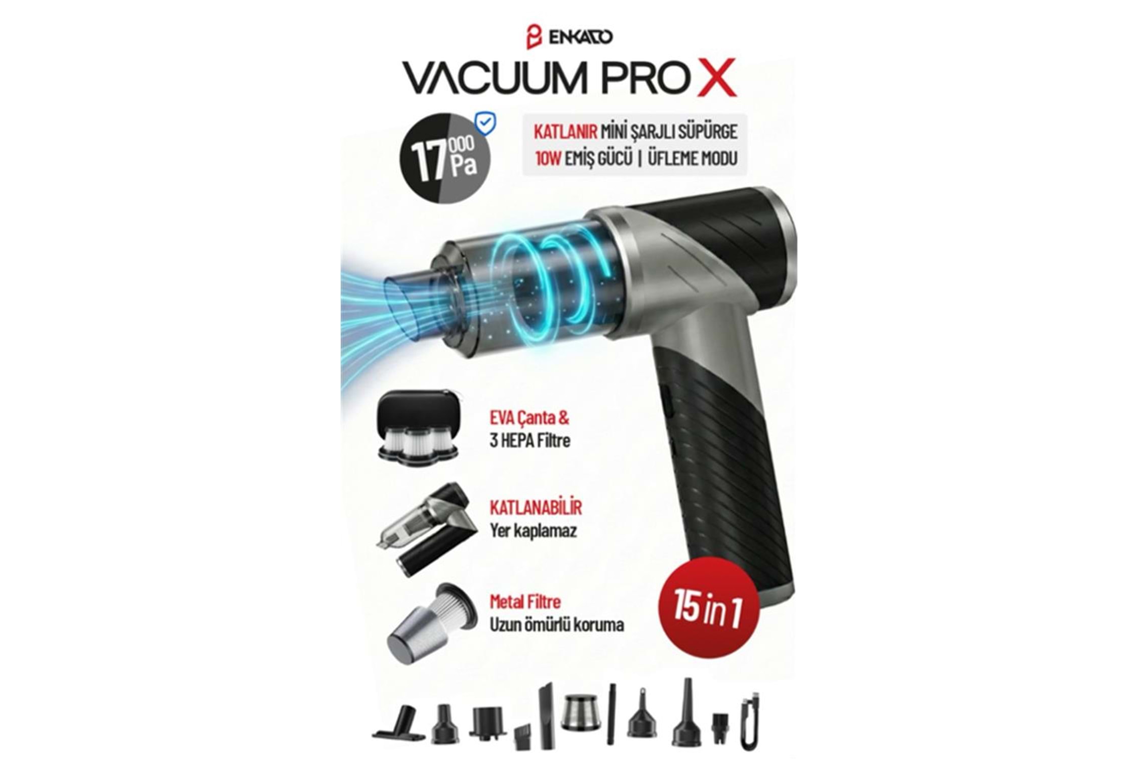 Enkado EKD-SP20 17000PA 2000MAH Güçlü Vakum-Üflemeli Şarjlı Katlanabilir Elektrikli Araç Süpürgesi 3ad Filtrr