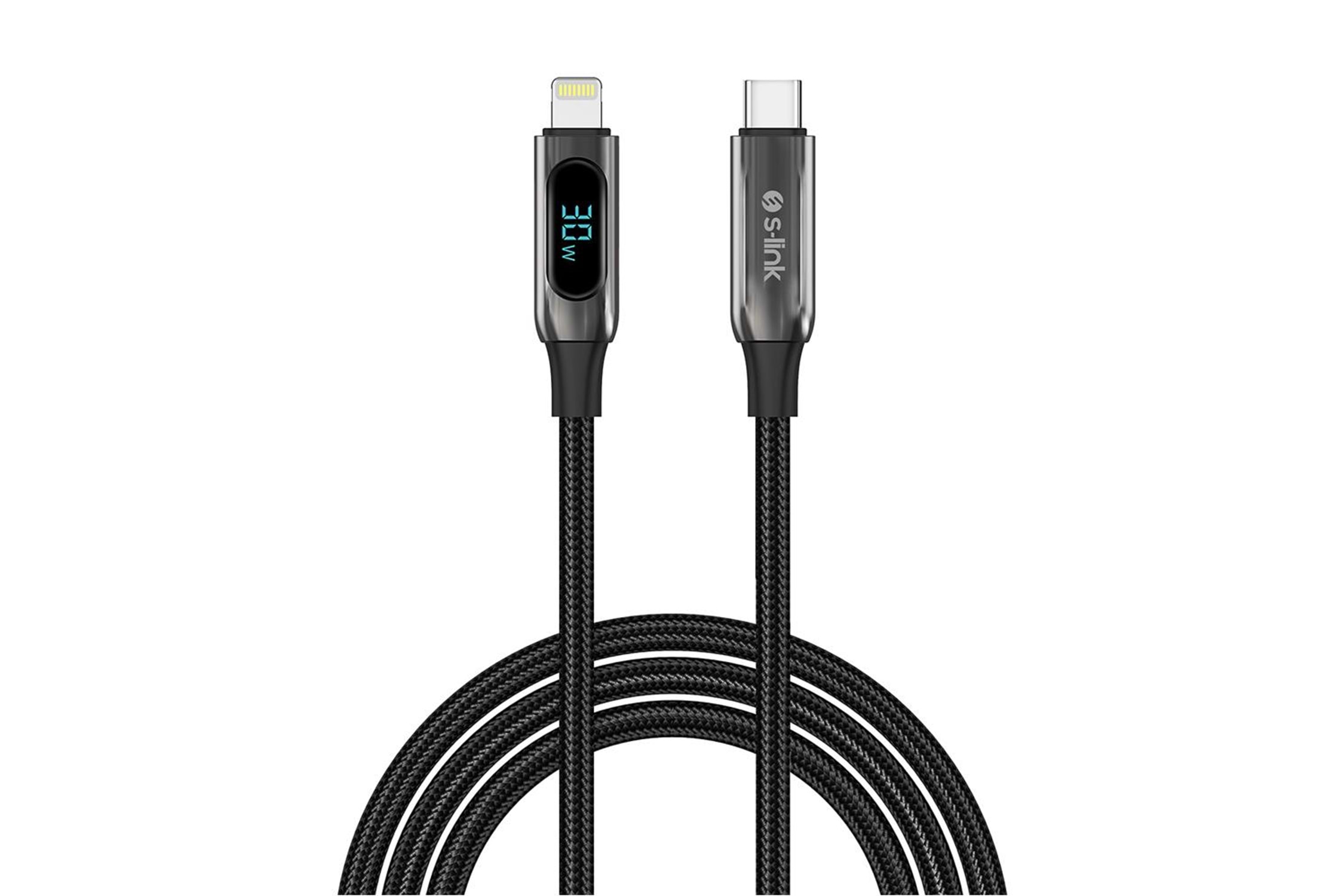 S-link Armor LED CL-030 30W 1m Type-C to Lightning PD Örgülü LED Başlıklı Siyah Hızlı Şarj Kablosu